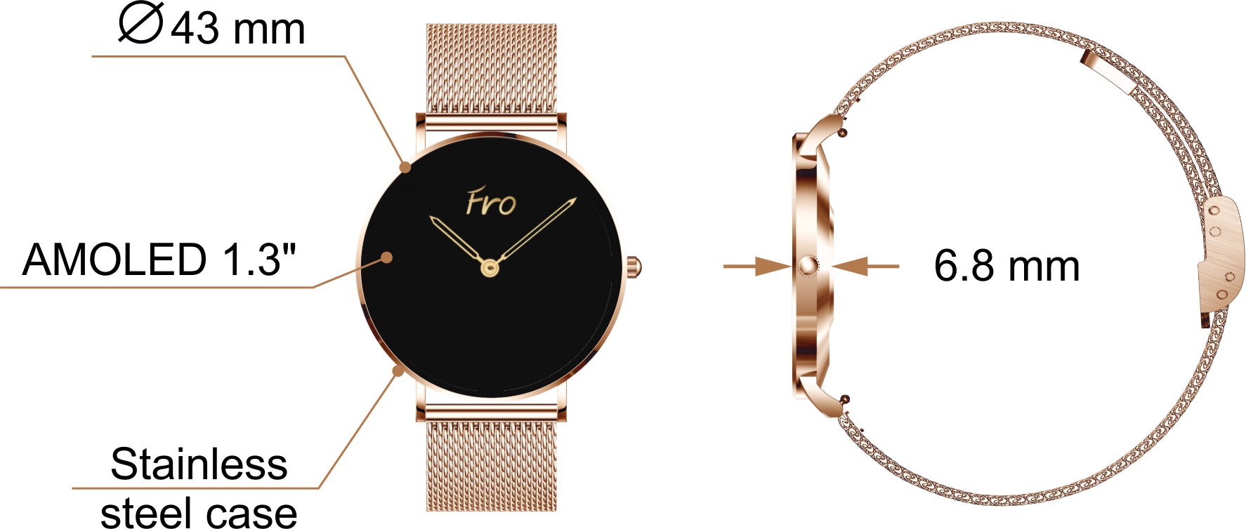 FRO LW-43, geniş ekranı, ultra ince gövdesi ve klasik premium çizgisiyle günlük stilini daha güçlü bir görünümle tamamlar. Şıklığı modern akıllı saat deneyimiyle bir araya getirerek hem zarif hem de etkileyici bir kullanım sunar.